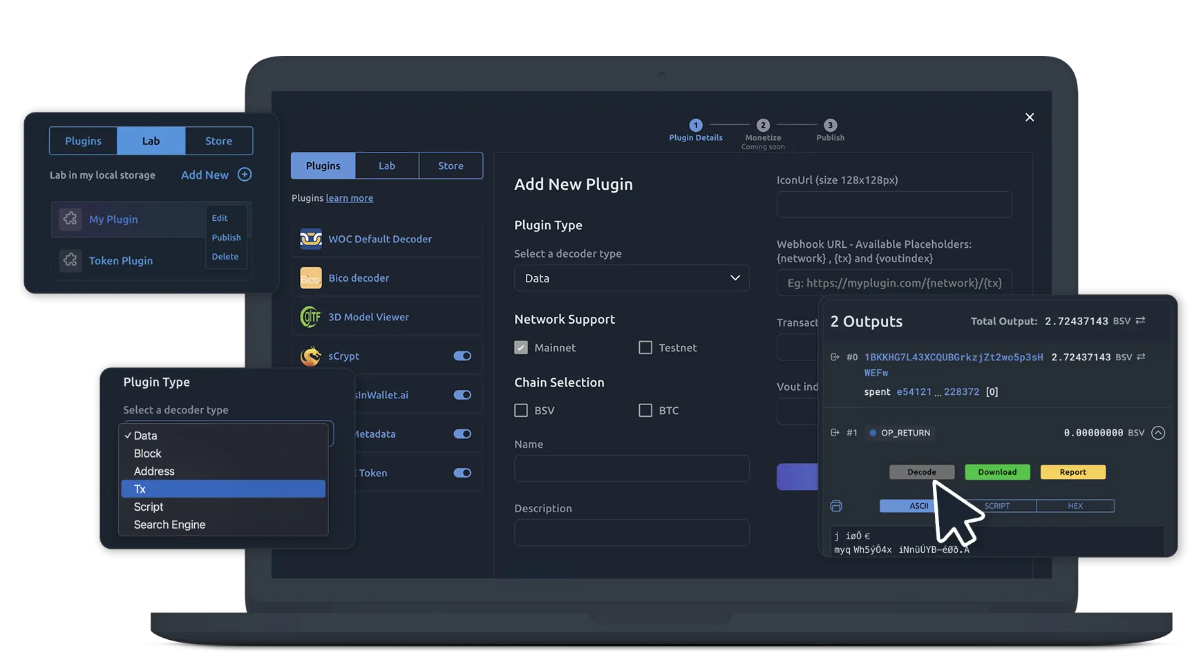 Connect your plugin with a Block, Transaction, Address, or a Script and decode your metadata.