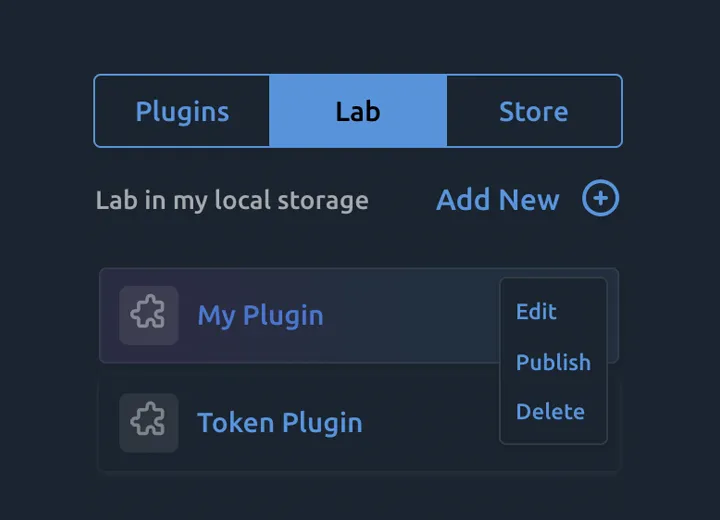 In the 'Lab' tab, add and test your plugin in your browser's local storage before requesting to publish it.