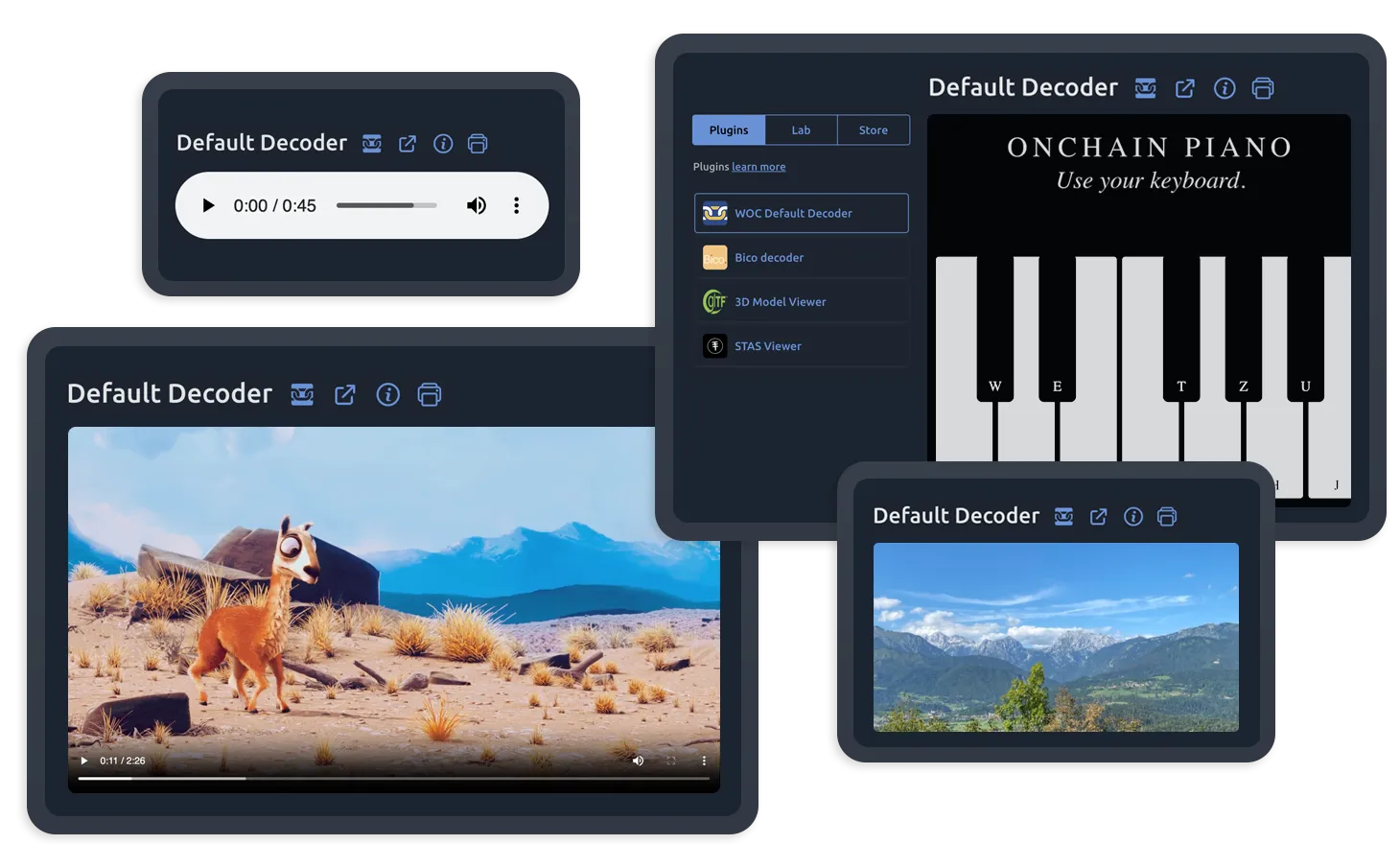 The built-in decoder plugin visualizes the data included in the transaction outputs, including video, audio, images, 3D objects, receipts, and much more.